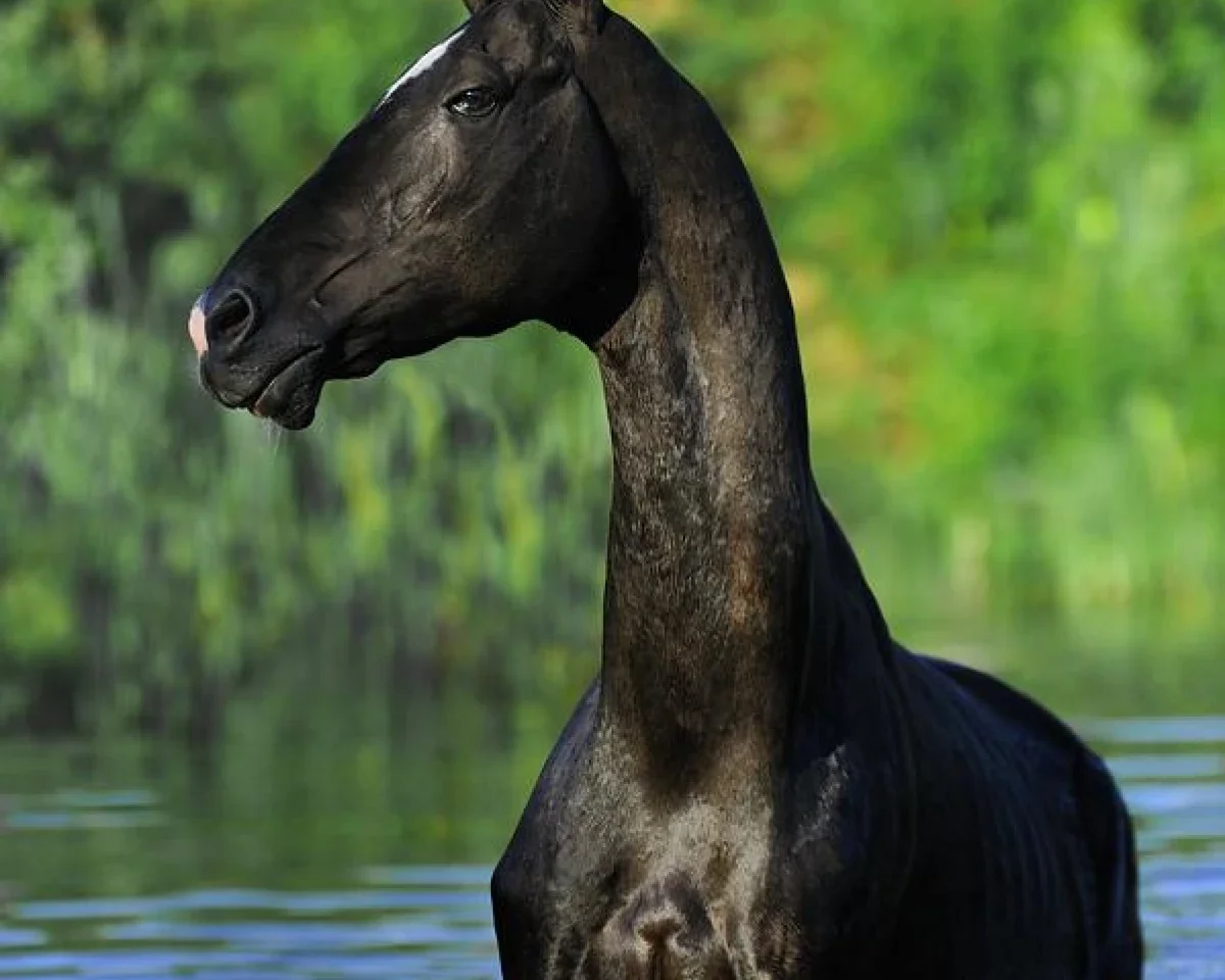 Osanna tiene la apariencia más “típica” Akhal-teke de nuestras yeguas fundadoras: líneas largas y finas, un cuello largo e incurvado, una cabeza esculturada, nariz aguileña, y orejas largas e incurvadas. Es muy atlética y flexible, una saltadora excelente, y aprende muy rápidamente. Sus movimientos son tan elásticos, que el jinete amortigua sin esfuerzo su trote y su galope.